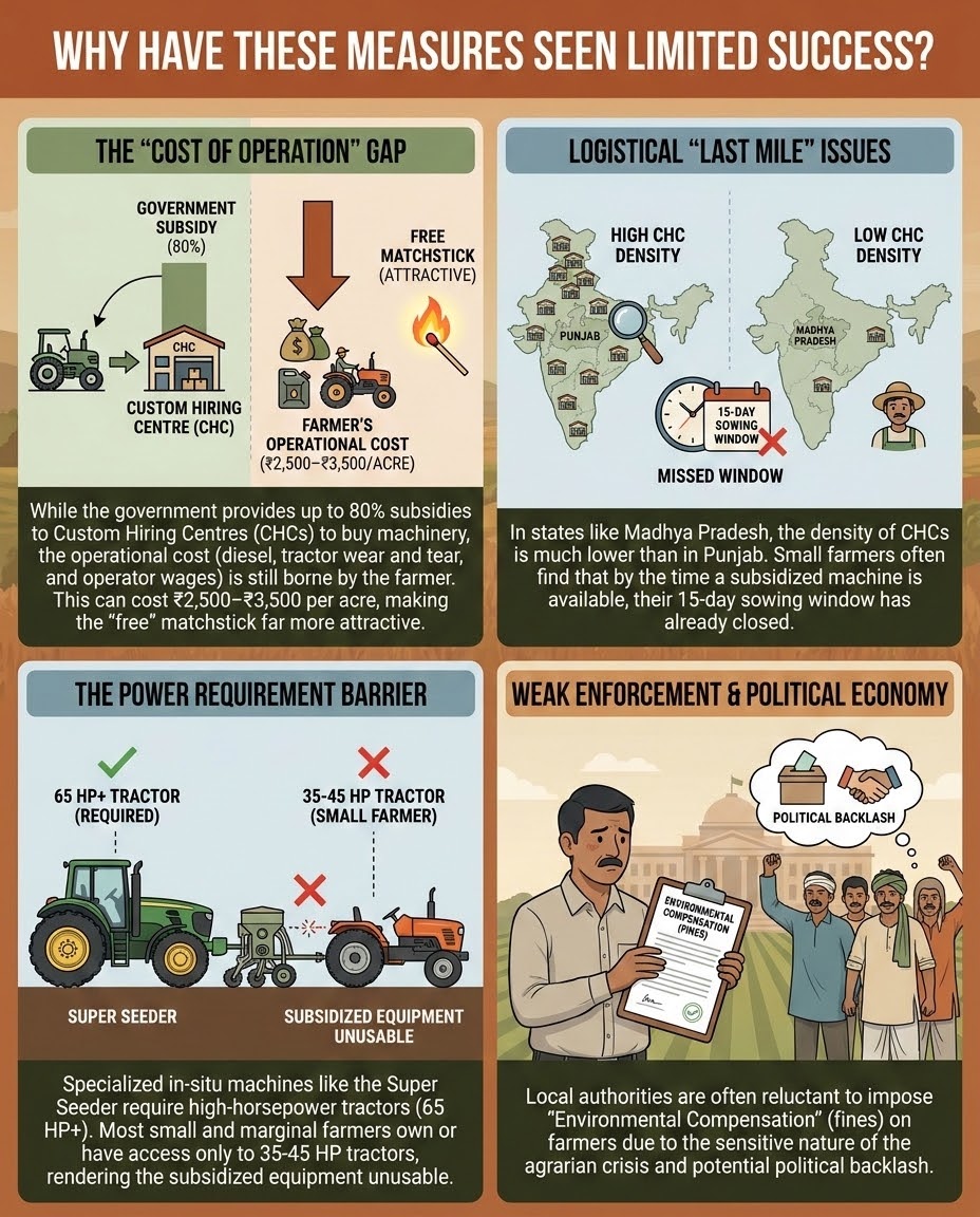 Small Landholdings: Since 85% of Indian farmers are small-scale, they lack capital for specialized machinery like "Super Seeders," despite available subsidies.
