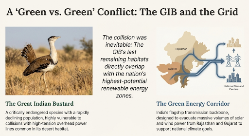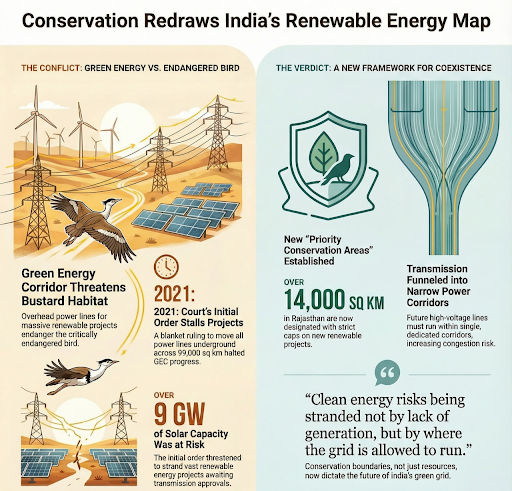 The Supreme Court’s December 2025 ruling recalibrated the Green Energy Corridor by balancing renewable expansion with Great Indian Bustard conservation. By replacing a blanket ban with priority zones, it ensured regulatory clarity for meeting India’s 500 GW non-fossil target, while highlighting challenges of land, finance, and coordination.
