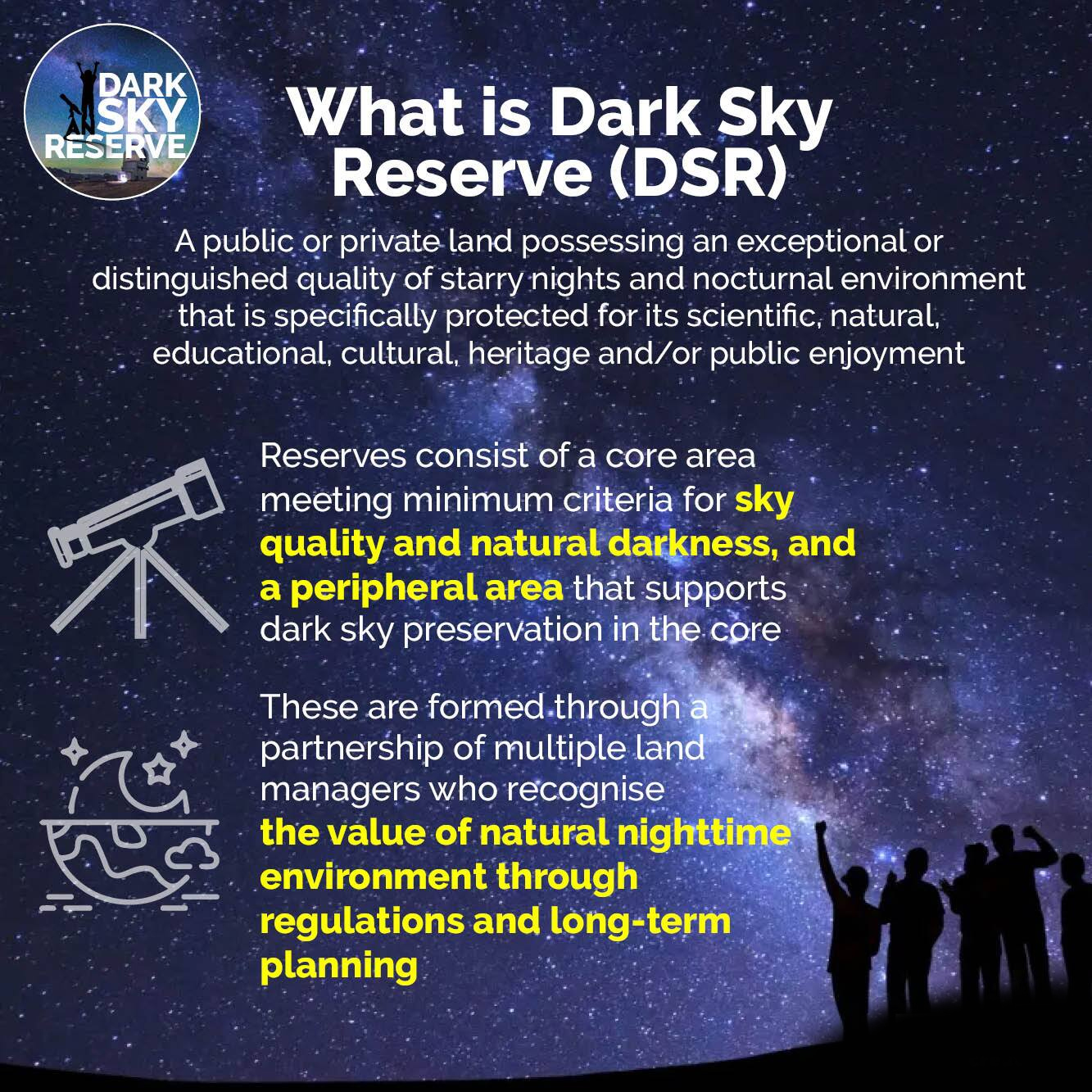Minimal Light Pollution: These areas restrict artificial light by using DarkSky Approved lighting (e.g., shielded, downward-facing fixtures) to prevent "sky glow".