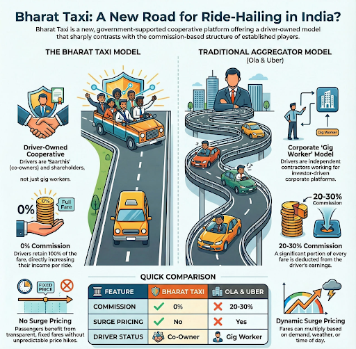 The primary difference is its business model. Unlike Uber and Ola which are profit-driven corporations that charge a commission (20-30%) from drivers, Bharat Taxi is a driver-owned cooperative. It plans to operate on a zero-commission basis initially, with profits being distributed among the driver-members.