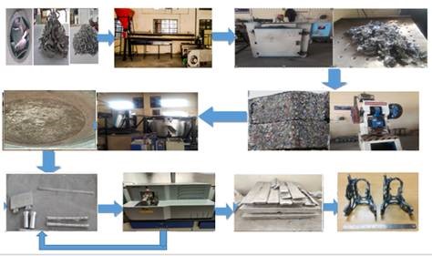 - The technology involves washing the basic inputs -- assorted aluminium scraps (mixed), drying and preheating, removal of basic impurities in melting furnace, degassing in nitrogen atmosphere and addition of alloying elements in holding furnace, filtering (refining) and pouring the metal into the mold.