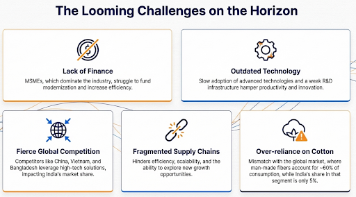 High logistics costs and inadequate infrastructure in key textile clusters reduce competitiveness. Schemes like PM MITRA are designed to address this gap.