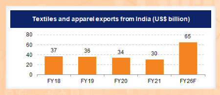 - India’s exports of textiles and apparel are expected to reach $100 bn in the next 5 years, growing at a CAGR of 11%.