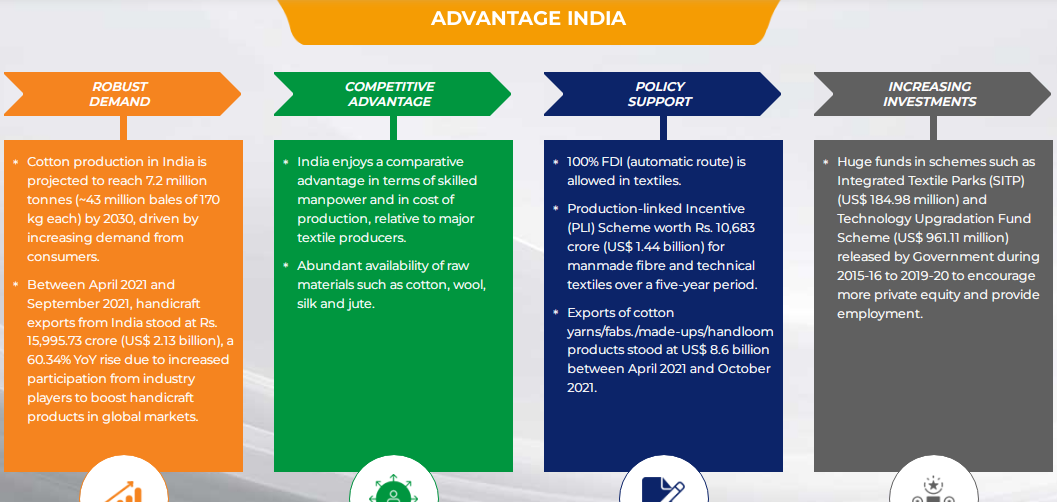 - Production-Linked Incentive (PLI) Scheme in Textiles Products for Enhancing India’s Manufacturing Capabilities and Enhancing Exports – Atmanirbhar Bharat.