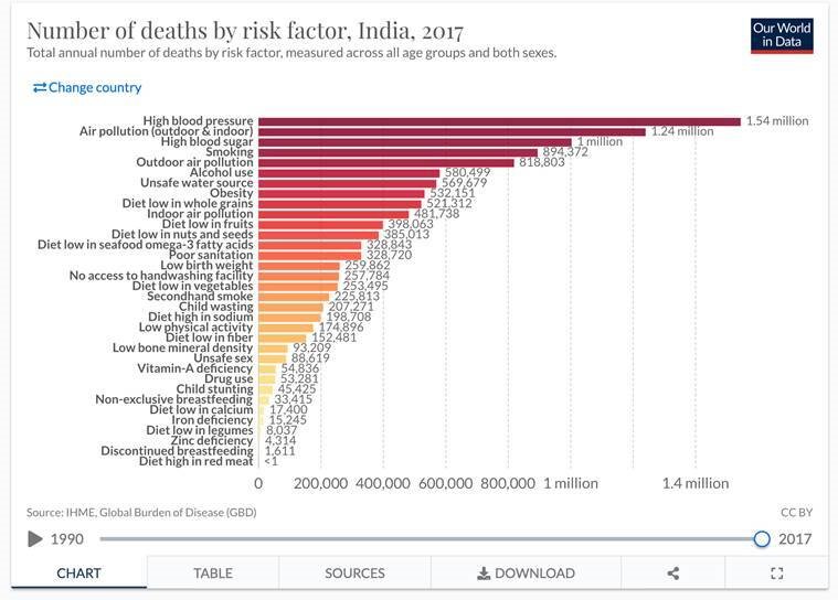 - “Air pollution” — both indoors and outdoors — as well as “poor sanitation, unsafe water sources, and no access to hand washing facilities” compete with risks due to high blood pressure, high blood sugar and smoking.