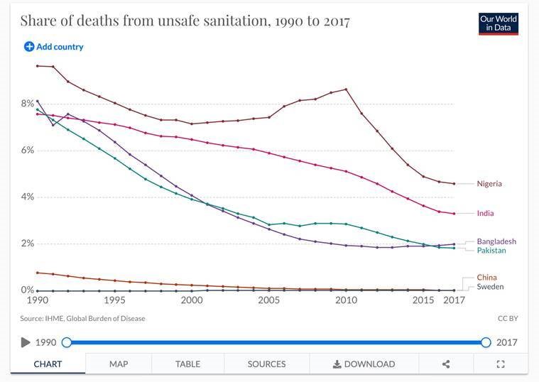 - The chart below shows how the share of deaths due to unsafe sanitation has changed over the years.