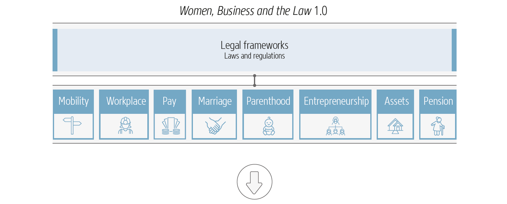 - This edition of the report updates the Women, Business and the Law0 index of eight indicators, structured around women’s interactions with the law as they begin, progress through, and end their careers: Mobility, Workplace, Pay, Marriage, Parenthood, Entrepreneurship, Assets, and Pension.