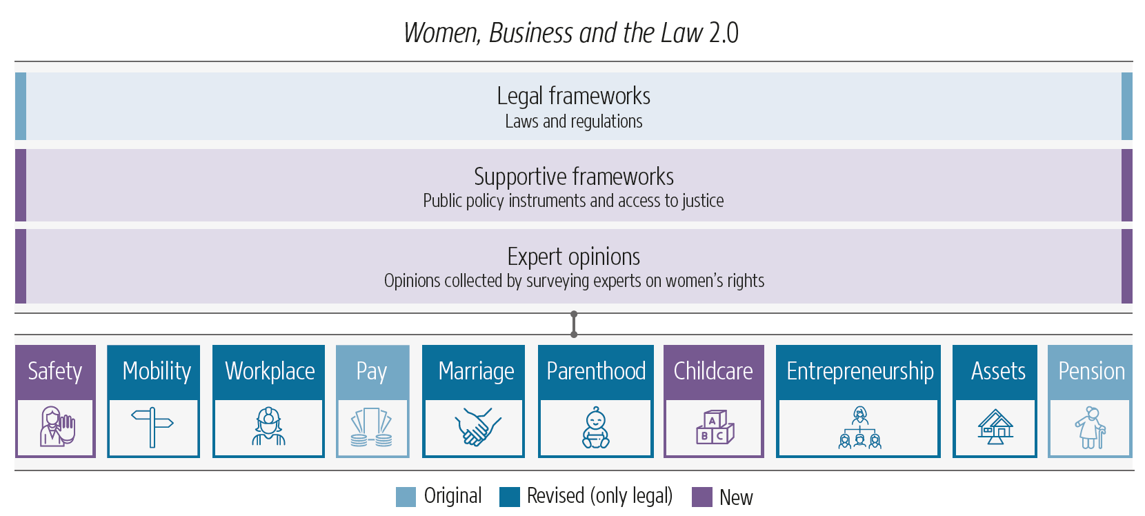 - Women, Business and the Law0 sets a new frontier for measuring the environment for women’s economic inclusion across three pillars: legal frameworks, measuring laws; supportive frameworks, measuring policy mechanisms to implement laws; expert opinions, shedding light on experts’ perception of women’s outcomes.