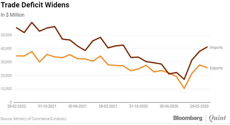 - India recorded a $20.1 billion trade deficit in April of 2022, higher than a $15.1 billion gap a year earlier, preliminary estimates showed. Exports increased 24.2% year-on-year to $38.19 billion and imports rose 26.6% to $58.26 billion.
