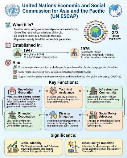 The 'Economic and Social Survey of Asia and the Pacific 2026' is a flagship report by the United Nations Economic and Social Commission for Asia and the Pacific. It analyzes regional macroeconomic trends, focusing on the impacts of West Asian conflicts, inflation, and the energy transition on economic growth.