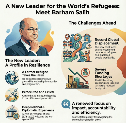 The UN General Assembly approved Barham Salih as head of UNHCR, the first from the Middle East since the 1970s. Founded in 1950 under the 1951 Refugee Convention, UNHCR protects refugees, IDPs, and stateless people. Led by Filippo Grandi until mid-2025, it upholds non-refoulement amid record displacement.