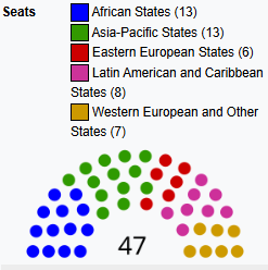 The Council is composed of 47 Member States elected for staggered three-year terms by an absolute majority vote in the UN General Assembly. This means a candidate must receive at least 97 votes from the 193 UN members.