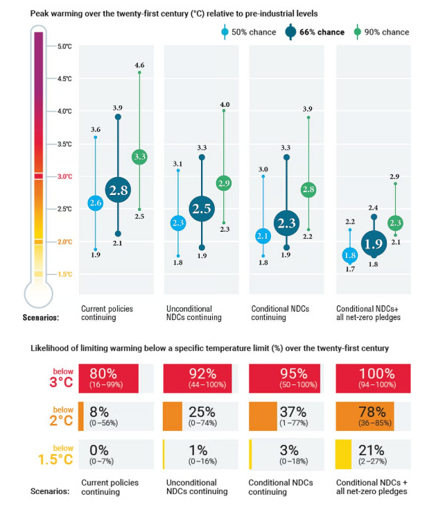 Global temperatures are projected to rise by 2.3–2.5°C this century, even if all NDCs are implemented.