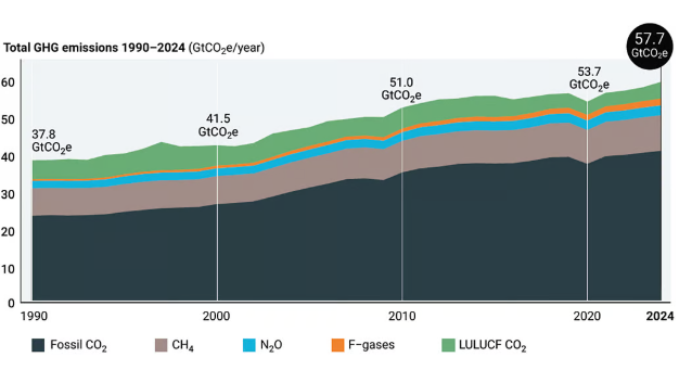 Global greenhouse gas emissions reached a record high of 57.7 gigatons of CO2 equivalent in 2024, an increase of 2.3% over the previous year. This indicates that emissions are not yet peaking, which is required to stay on track for the 1.5°C target.