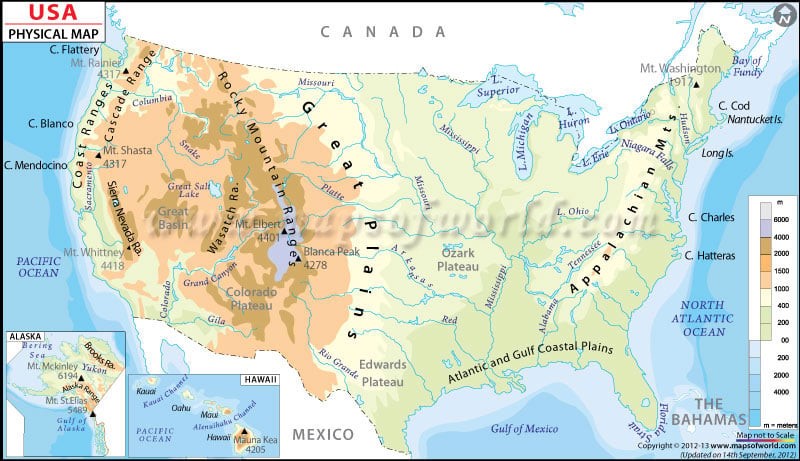 1. Appalachian Mountains – Old, eroded mountains in the east. 2. Rocky Mountains – Major mountain range in the west, highest point: Mount Elbert. |