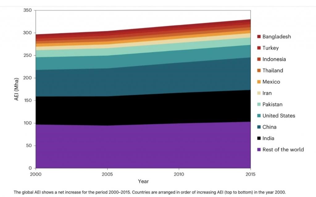 - They found that AEI increased by 11% from 2000 (297 Mha) to 2015 (330 Mha), with areas of both substantial expansion, such as northwest India and northeast China, and decline, such as Russia.