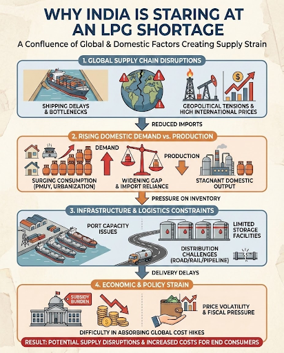 India is facing a Liquefied Petroleum Gas (LPG) supply crisis triggered by escalating military conflict in West Asia involving the U.S., Israel, and Iran.