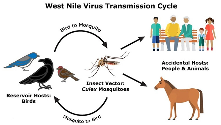 Mosquitoes become infected when they feed on infected birds, which circulate the virus in their blood for a few days.