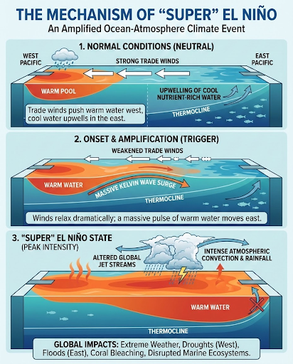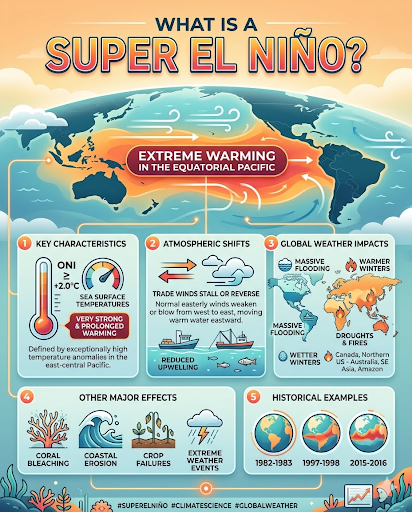 A Super El Niño is a strong warming of the central and eastern Pacific Ocean. It occurs when sea-surface temperatures rise above average, causing extreme global weather shifts, including severe floods, catastrophic droughts, and record-breaking heat across continents.