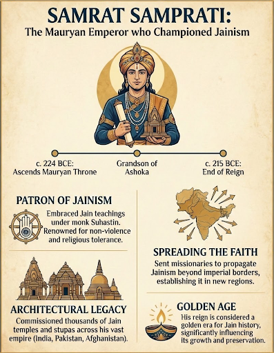 Samrat Samprati (c. 224–215 BCE) was the grandson of Emperor Ashoka and a Mauryan ruler from Ujjain. Known as the "Jain Ashoka," he is credited with spreading Jainism across Western and Southern India.