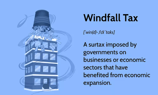 A windfall tax is a tax imposed by the government on industries that generate unexpected and significant profits as a result of extraordinary circumstances, such as geopolitical disruptions or natural disasters.