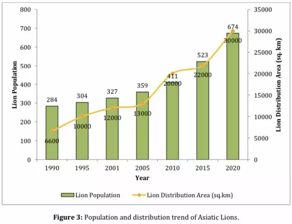 Population: As per the 14th Asiatic Lion Census 2005, the lion population was estimated at 523 individuals. In August 2017, surveyors counted 650 wild lions. The 15th Asiatic Lion Census could not be conducted in 2020, as scheduled, because of the COVID-19 pandemic. In June 2020, an estimation exercise counted 674 Asiatic lions in the Gir forest region, an increase of 29 per cent over the 2015 census figure.