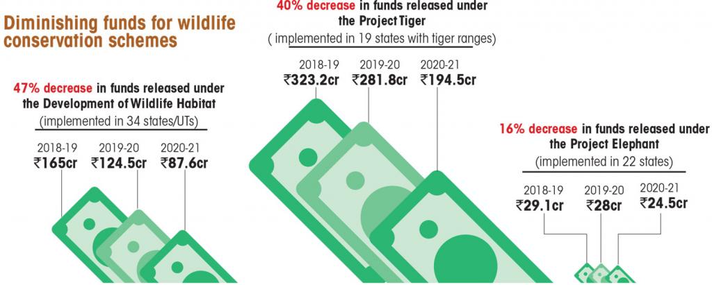 - Fund crunch: The Union government has cut the funds released under three flagship wildlife schemes even though poaching remains rampant.