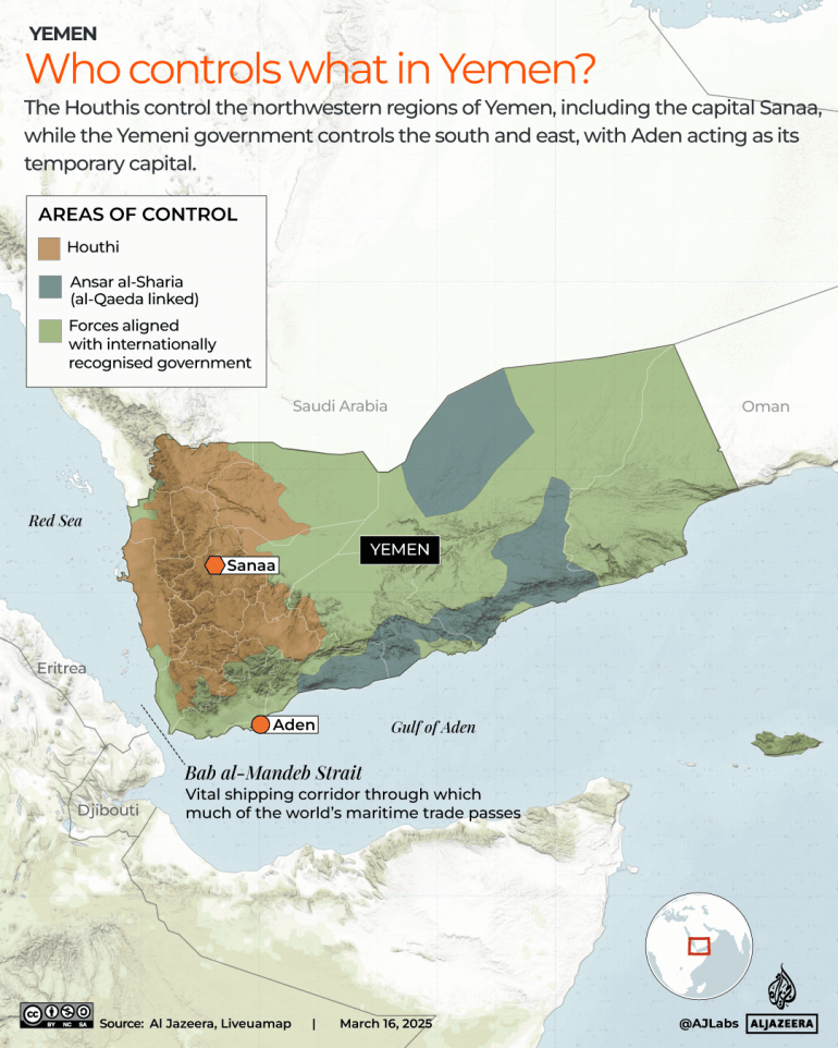 They control Sanaa (Yemen capital) & much of northwest while Yemeni government controls southern & eastern areas (capital in Aden).