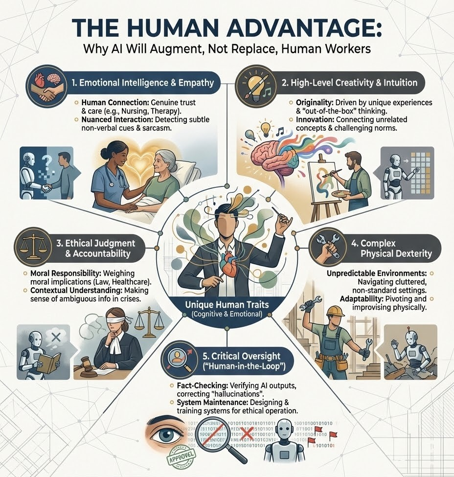 AI excels at processing vast datasets and performing repetitive tasks with speed and accuracy. However, humans remain superior in areas requiring contextual understanding, intuitive judgment, creativity, and complex problem-solving. The future of work lies in a human-AI collaboration model where technology augments human capabilities.