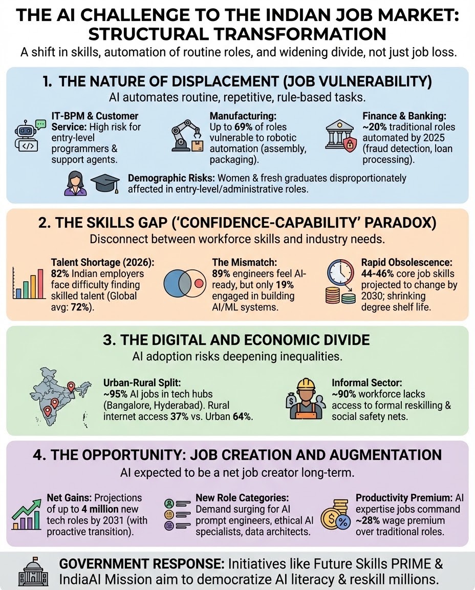 The rise of Artificial Intelligence threatens millions of jobs in the Indian IT sector, necessitating an urgent overhaul of the education and skilling ecosystem.