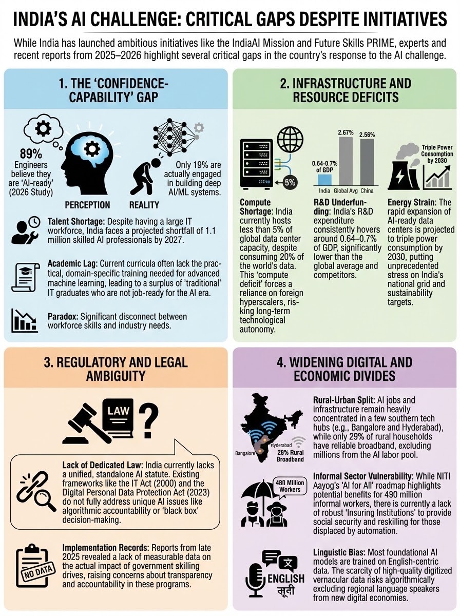 India's investment in R&D is critically low, remaining stagnant at around 0.64% of its GDP. This is significantly lower than innovation-driven economies like the US (3.48%) and China (2.43%), which hinders indigenous innovation and competitiveness in the AI race.