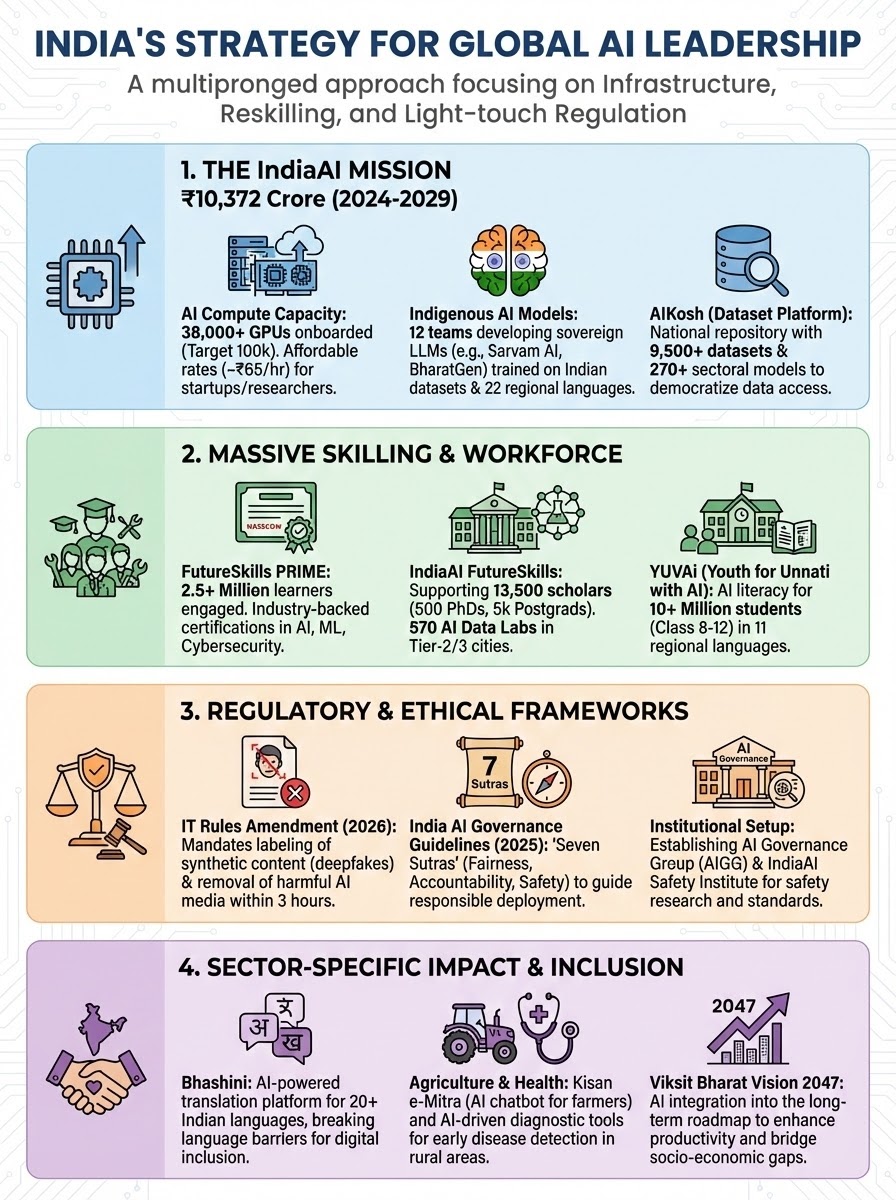 Viksit Bharat Vision 2047: AI is integrated into the national long-term roadmap to enhance productivity and bridge socio-economic gaps.