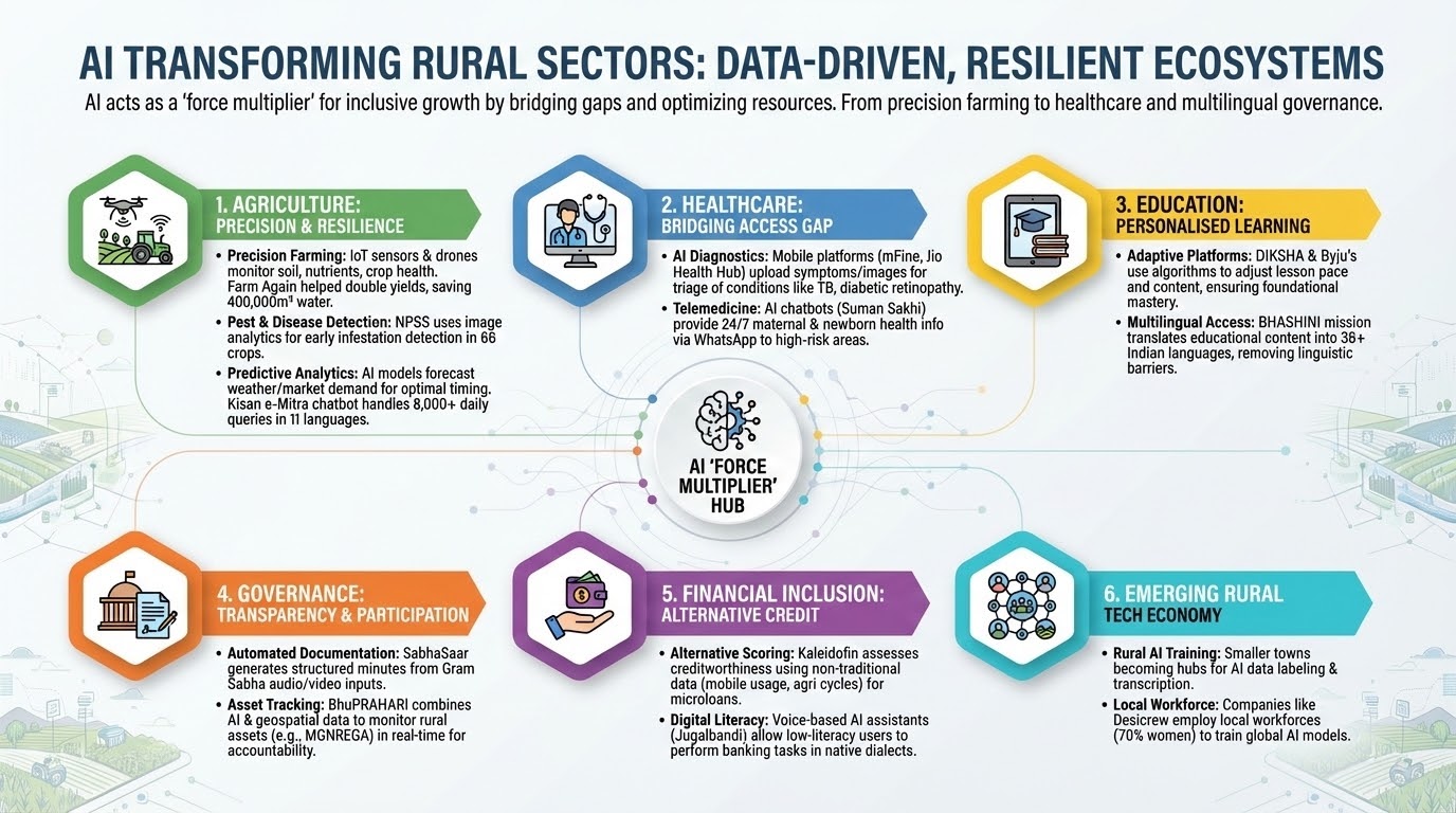AI is transforming rural sectors into data-driven, resilient ecosystems by treating the technology as a digital public good for inclusive development.