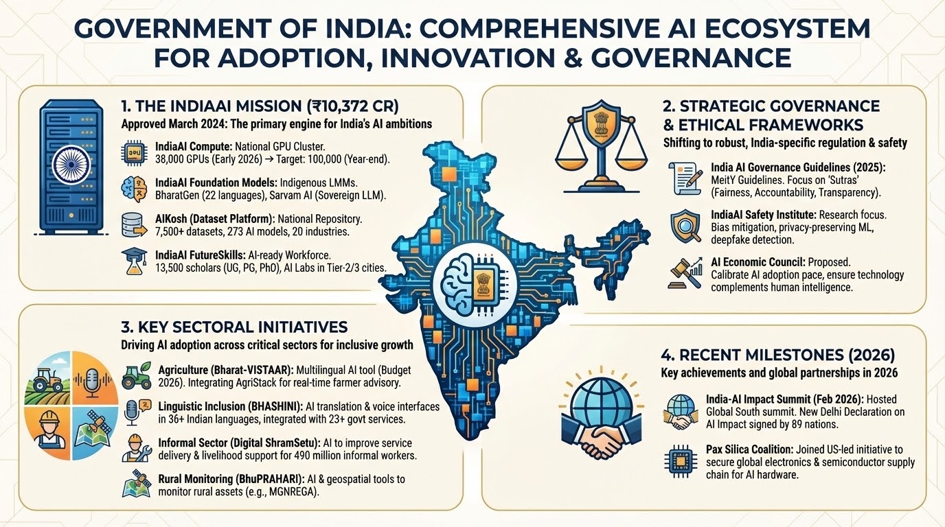 AIKosh: A national data platform hosting over 9,500 datasets and 273 sectoral models, serving as a central repository for public-sector AI innovation.