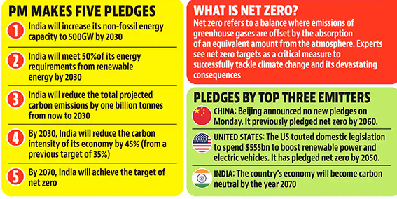 Net-zero by 2070. "Panchamrita" goals include 500 GW non-fossil capacity and 50% energy from renewables by 2030. |