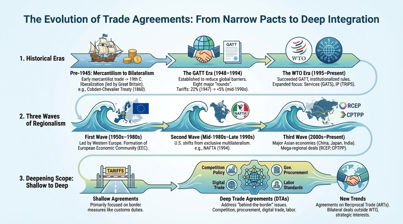 The nature of trade agreements has evolved through three distinct phases, moving from simple market access to deep, strategic integration.