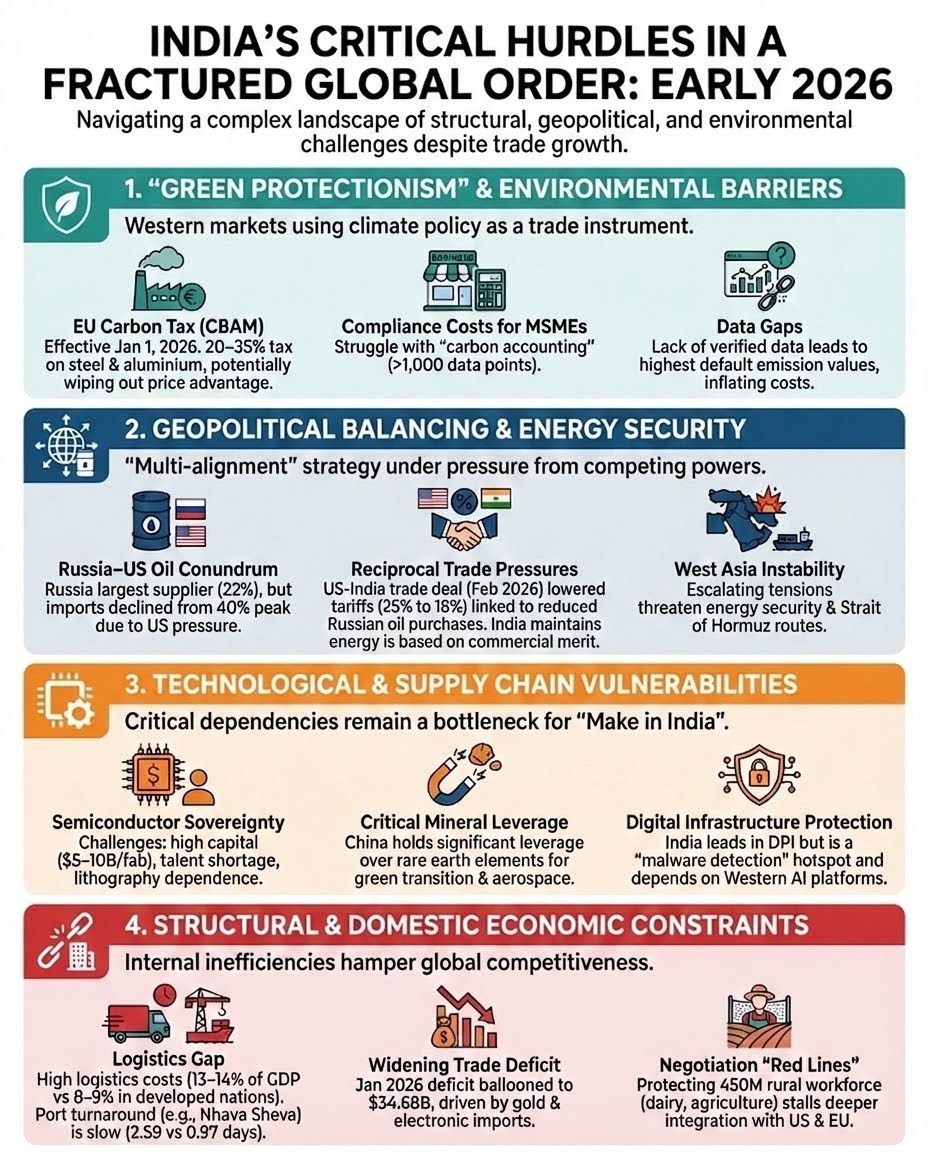 Carbon Border Adjustment Mechanism (CBAM): This EU "carbon tax" could impose an additional 20–35% duty on Indian exports like steel, aluminium, and cement. This effectively neutralises the 0% tariff gains won in the India-EU FTA.