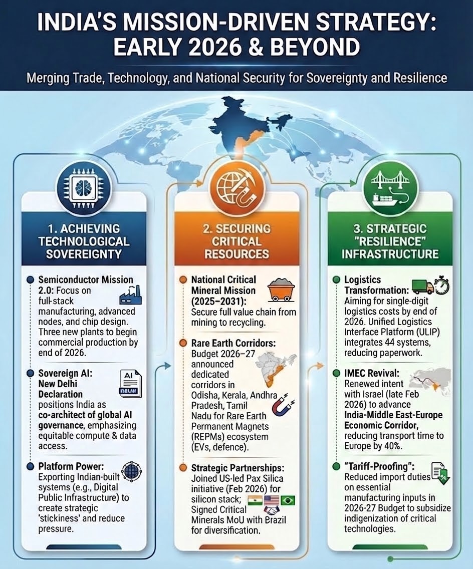 Securing the "Brains": India needs to leverage coalitions like Pax Silica (2026) to secure semiconductor supply chains, ensuring that its AI-driven agriculture and healthcare sectors are immune to external "chip blockades".