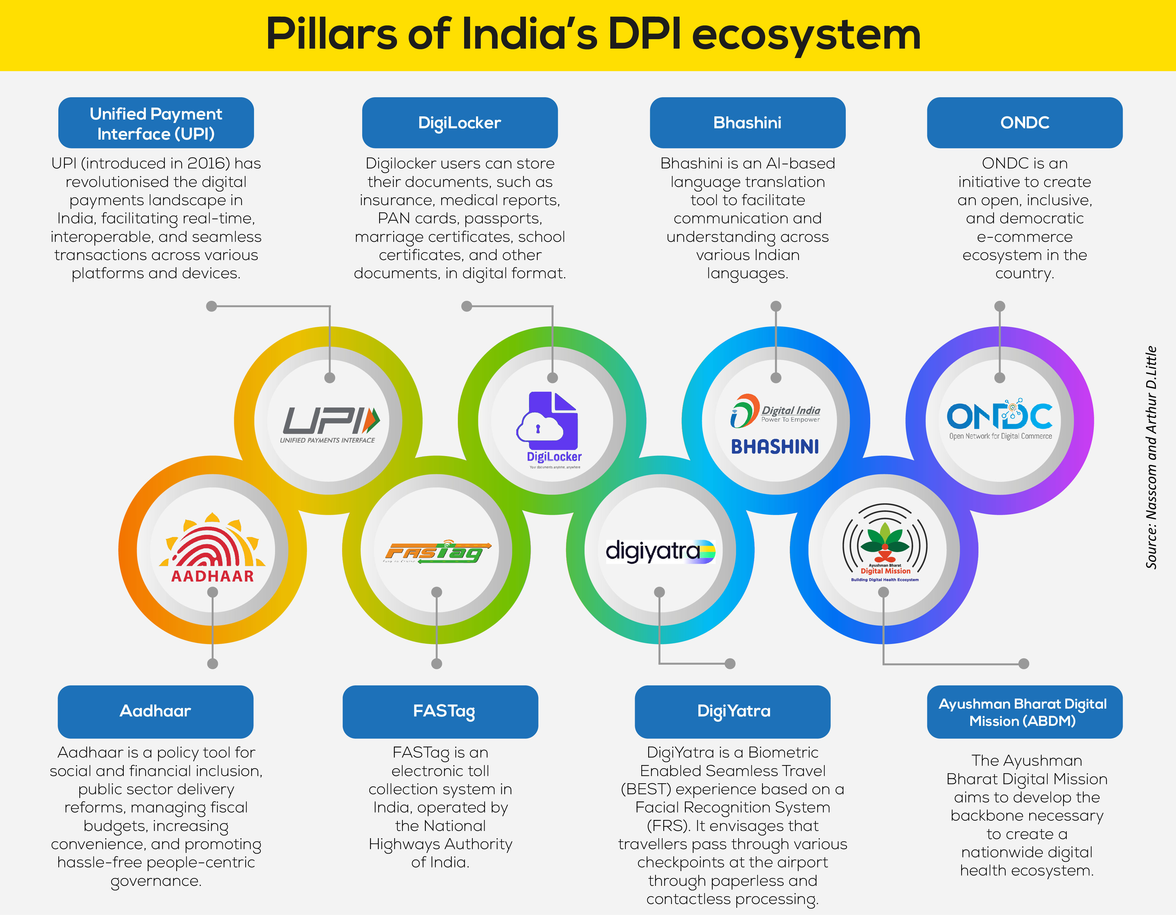 India's layered DPI, the India Stack, enables system connection and innovation—a key ecosystem approach for public-benefit AI.