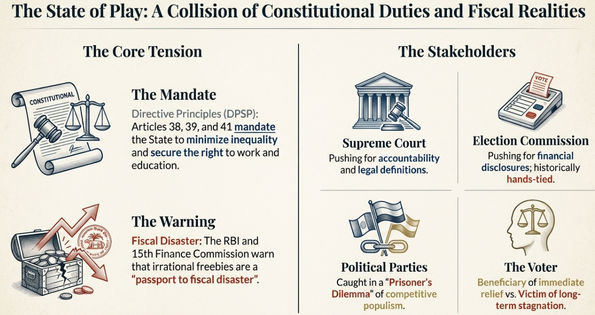 The Supreme Court clarified the "freebies" debate, distinguishing between legitimate public welfare and damaging, voter-driven distributions that threaten state finances and fair elections.