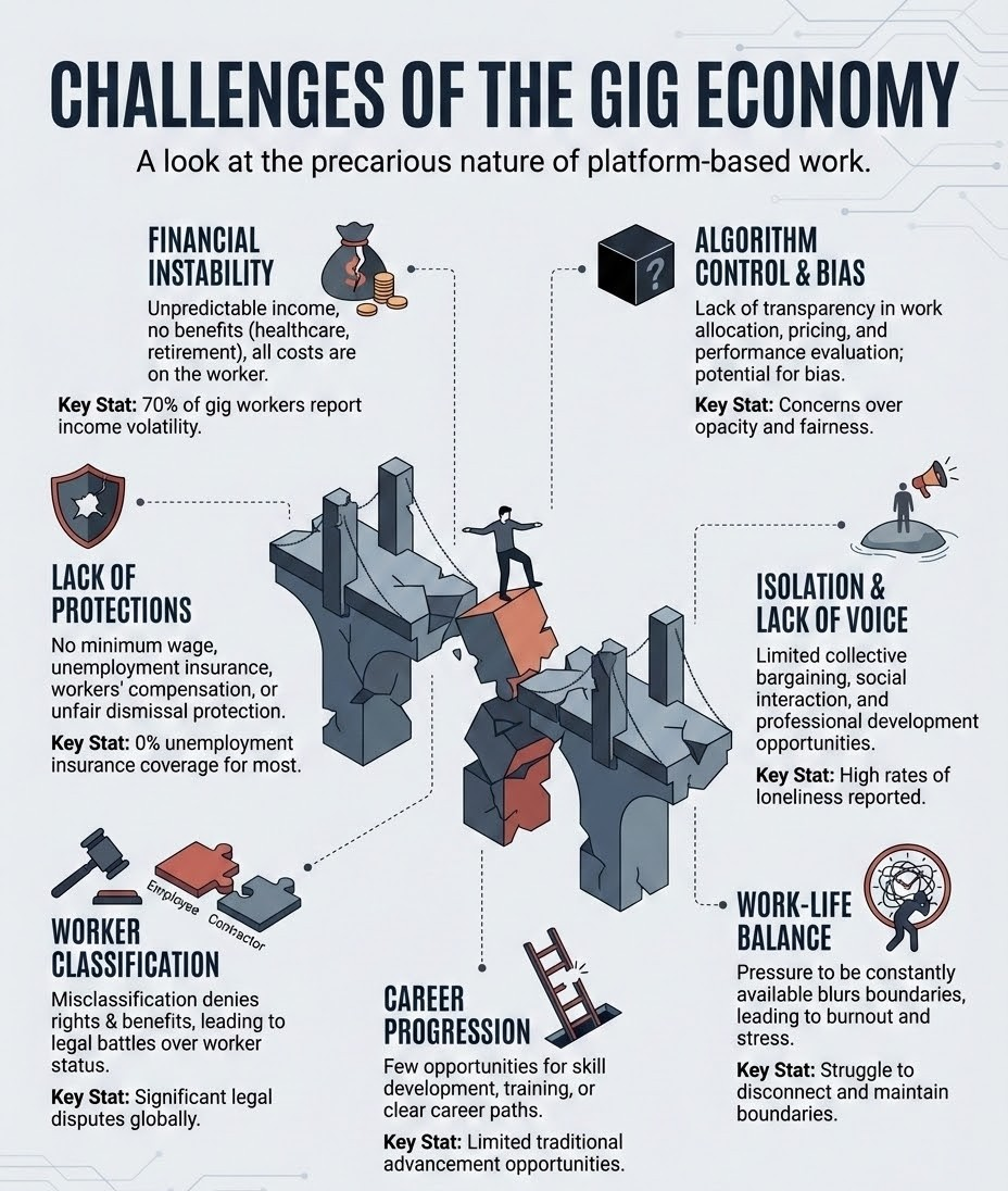 Lack of Collective Bargaining: Because they are not "employees," gig workers lack the legal right to form recognized unions under traditional labor laws, leaving them with little negotiating power against large tech aggregators.