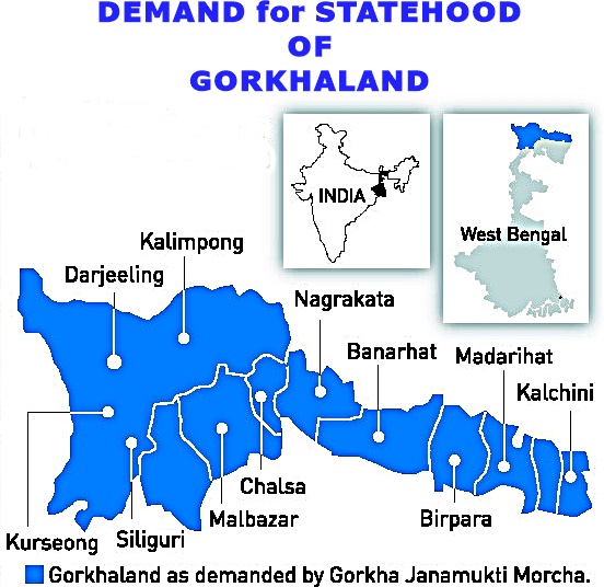 Gorkhaland is a proposed state that would be carved out of the northern parts of West Bengal. The demand is for the creation of a separate administrative unit for the Nepali-speaking Gorkha ethnic community residing in the Darjeeling hills, Kalimpong, Kurseong, and the Dooars region.