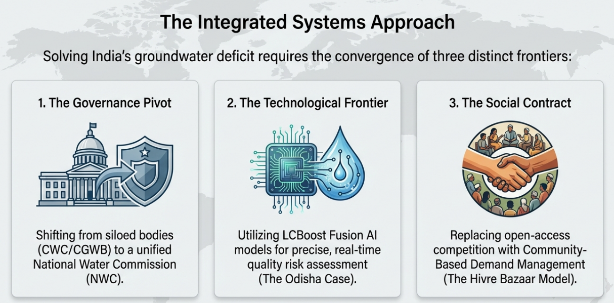 Solving groundwater crises requires an integrated, demand-focused, and community-led approach combining legal reforms, economic incentives, and technology to ensure long-term sustainability.
