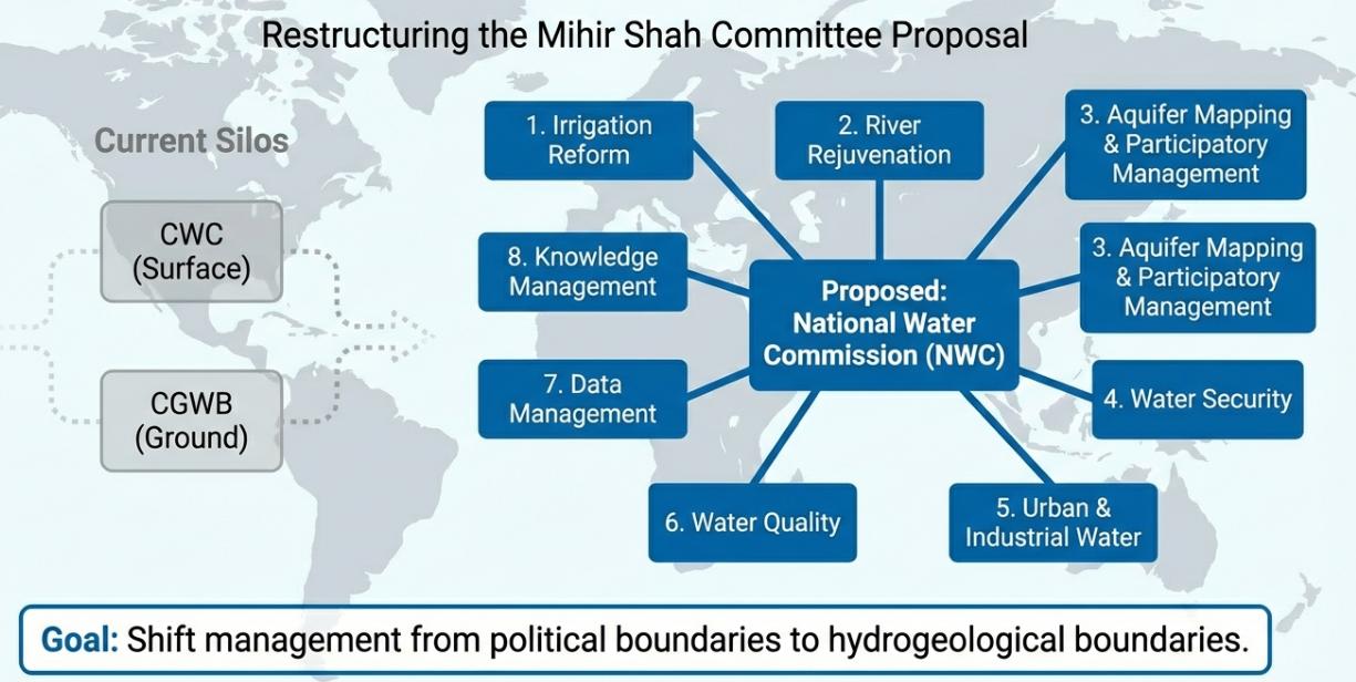 The siloed water management approach, divided between the Central Water Commission (CWC) for surface water and the Central Ground Water Board (CGWB) for groundwater, was recommended for unification into a single National Water Commission (NWC) by the Mihir Shah Committee (2016), though the NWC has not been established as of January 2026.