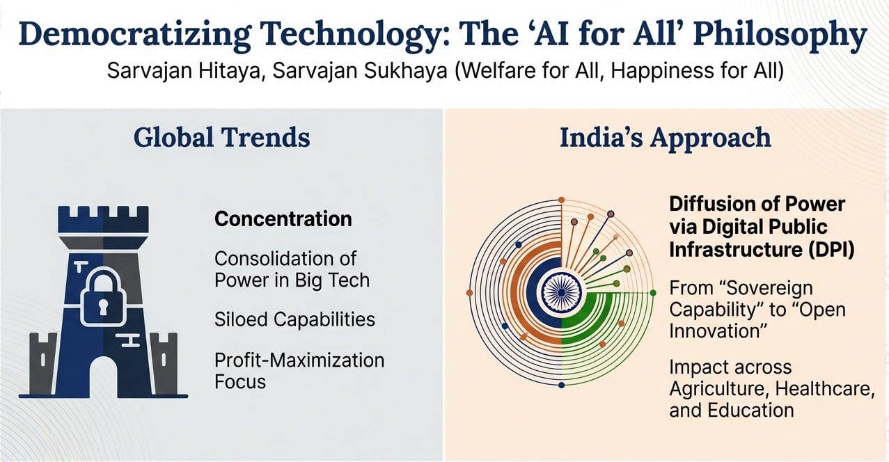 India democratizes AI infrastructure access via the IndiaAI Mission to prevent Big Tech monopolization, providing affordable high-performance computing.