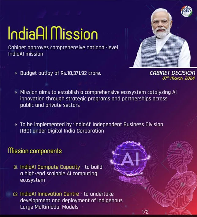 The Union Cabinet approved ₹10,372 crore for the IndiaAI Mission to boost AI application development in sectors like healthcare, expanding computing access, research, and startup support.