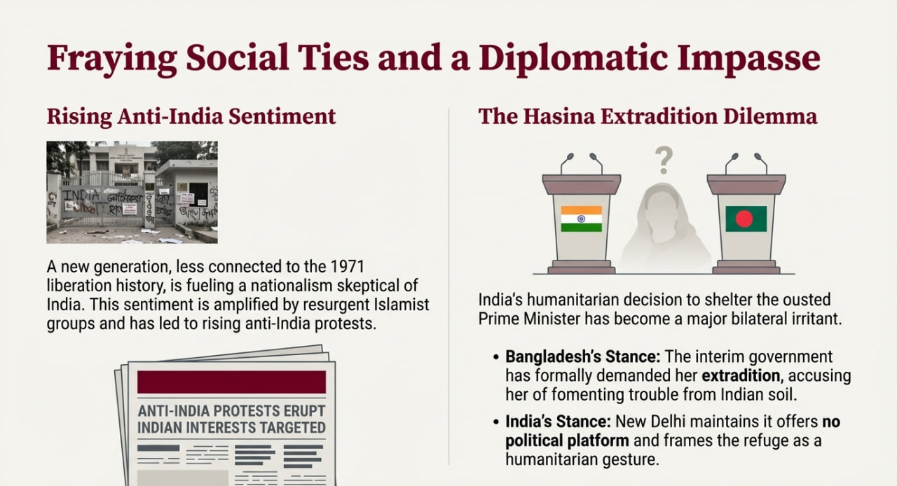 Relations have strained following the August 2024 resignation of Prime Minister Sheikh Hasina, whose government was considered pro-India. The new interim government and the rise of political forces with perceived anti-India views have altered diplomatic dynamics, leading to mutual recriminations and trade restrictions.