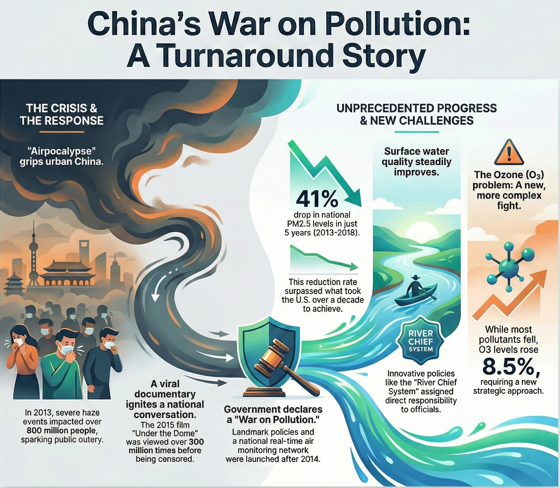 In the early 2010s, China faced a severe environmental crisis. In 2013, the average annual PM2.5 concentration in its cities was 61 µg/m³, with Beijing’s levels often exceeding 500 µg/m³, a phenomenon dubbed the "airpocalypse". (Source: UNEP)