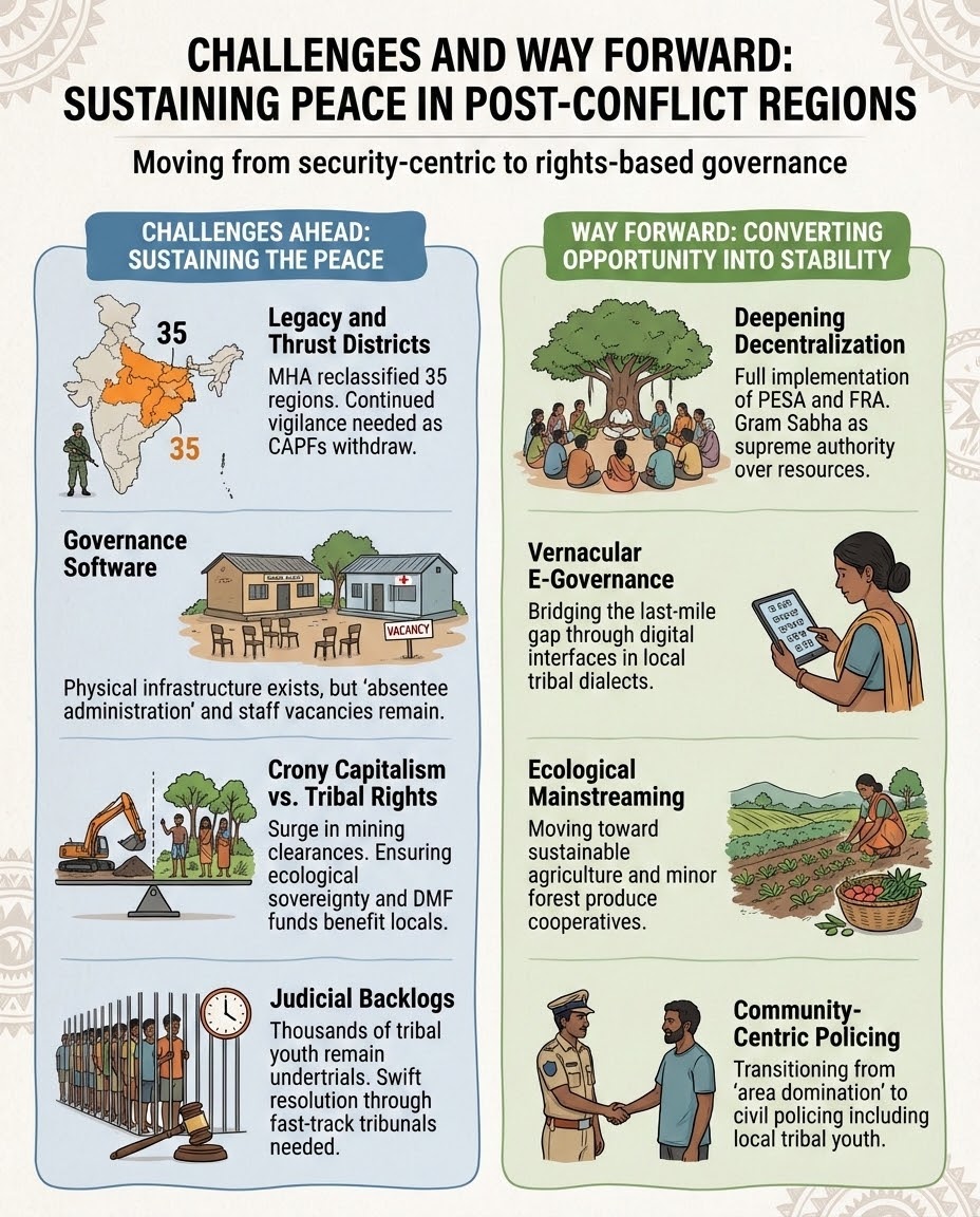 Lasting peace requires a transition from security-led operations to rights-based governance, focusing on the saturation of development schemes, strict implementation of the Forest Rights Act, and the empowerment of Gram Sabhas to permanently eliminate the socio-economic alienation that fuels insurgency
