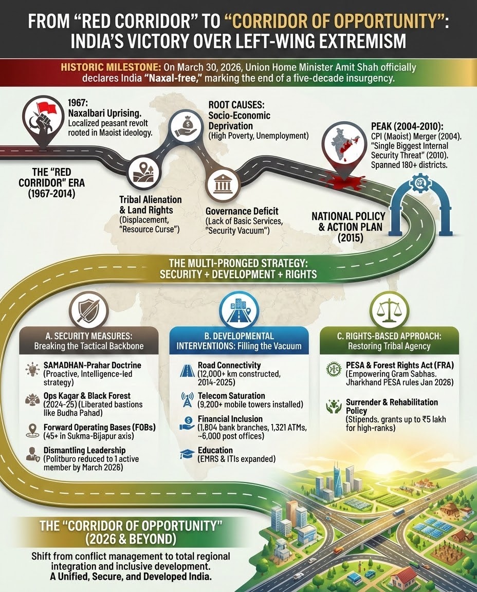 The Union Home Minister declared India Naxal-free, shifting the focus from military operations to tribal reconciliation and inclusive development in former extremist strongholds.